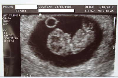 At our appointment we had the ultrasound & got to listen to the heartbeat, had an OB educator meeting, and an appointment with my doctor. Here is a picture from our ultrasound...hard to believe this little thing is only the size of a green olive when its actually starting to look like a real baby in this picture! The coolest part of the ultrasound was seeing the actual heart beating. I had no idea that you would be able to see that. Our baby was also moving their little arms around which was really neat! Heartbeat was pretty high at 180 (but in the normal range for this early).
